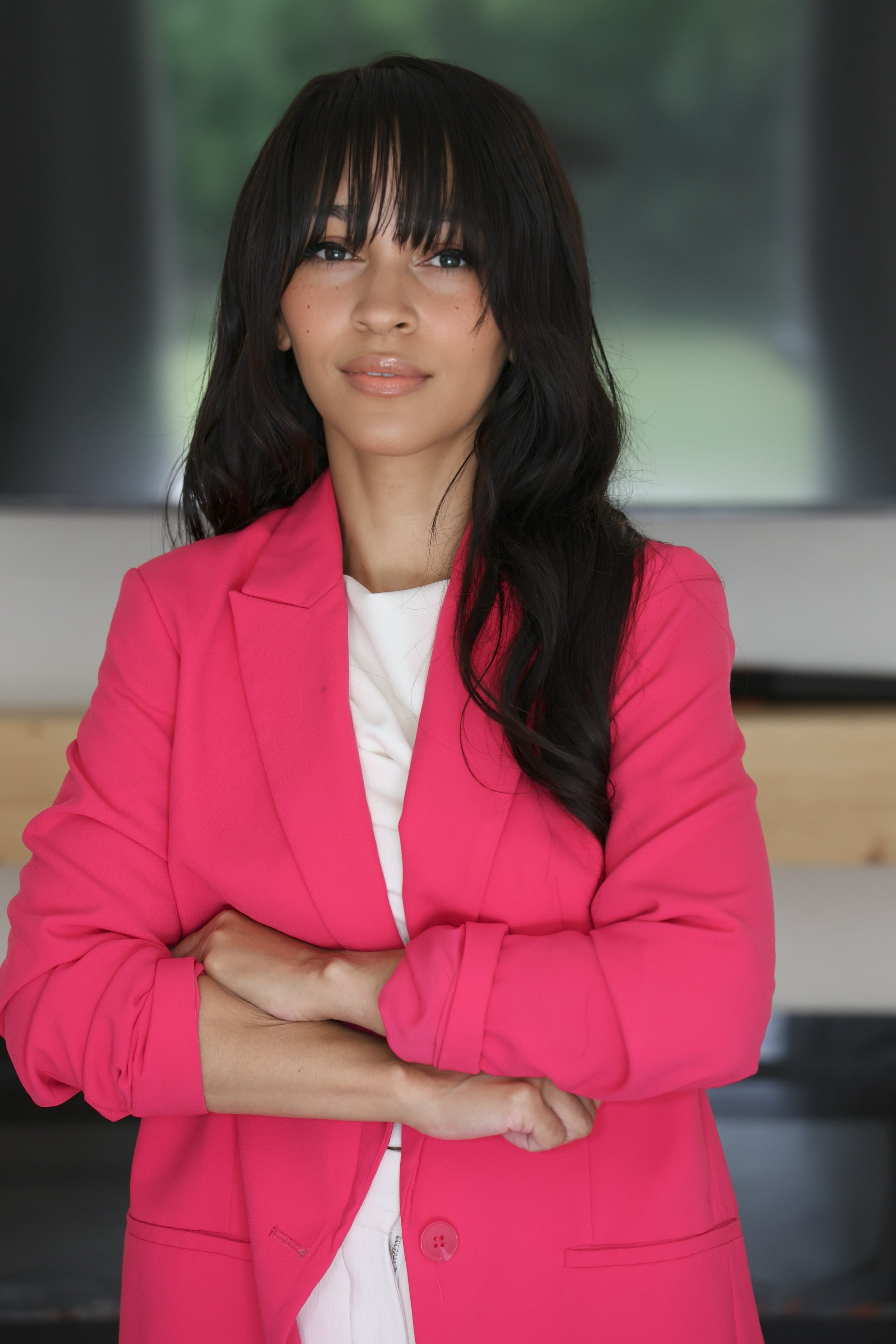 A woman with long dark hair and bangs, wearing a bright pink blazer over a white shirt, standing with crossed arms in an indoor setting with a blurred background.